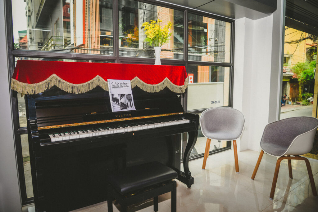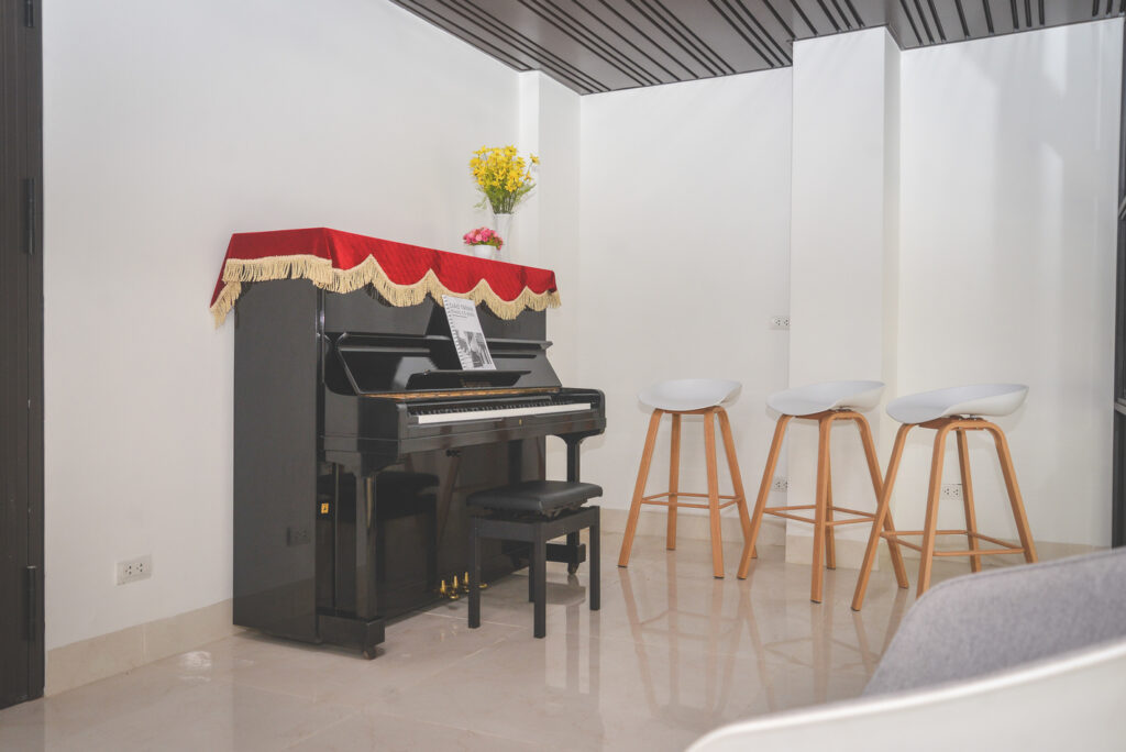 Đàn Upright Piano hiện đại và phòng học riêng cho học viên khóa học 1-1 với giáo viên.