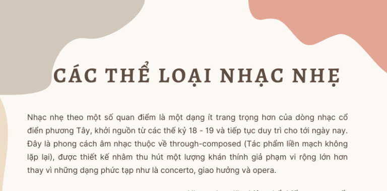 Nhạc nhẹ theo một số quan điểm là một dạng ít trang trọng hơn của dòng nhạc cổ điển phương Tây, khởi nguồn từ các thế kỷ 18 – 19 và tiếp tục duy trì cho tới ngày nay. Đây là phong cách âm nhạc thuộc về through-composed (Tác phẩm liền mạch không lặp lại), [...]